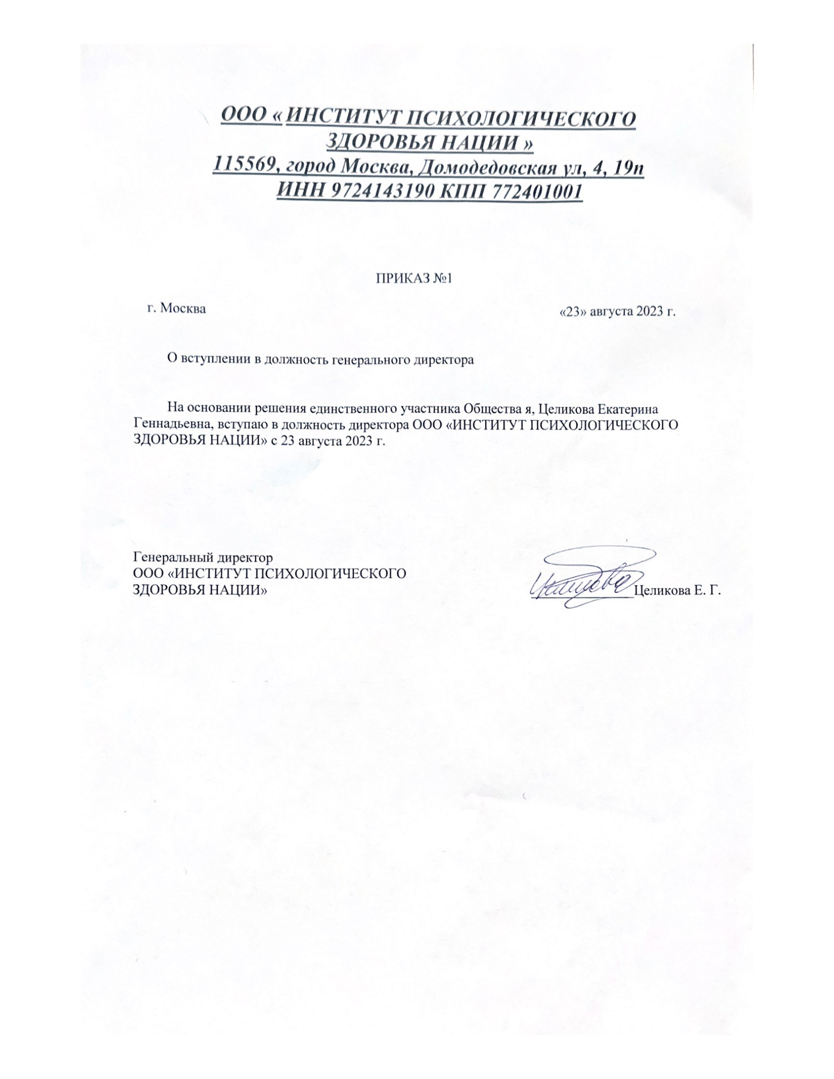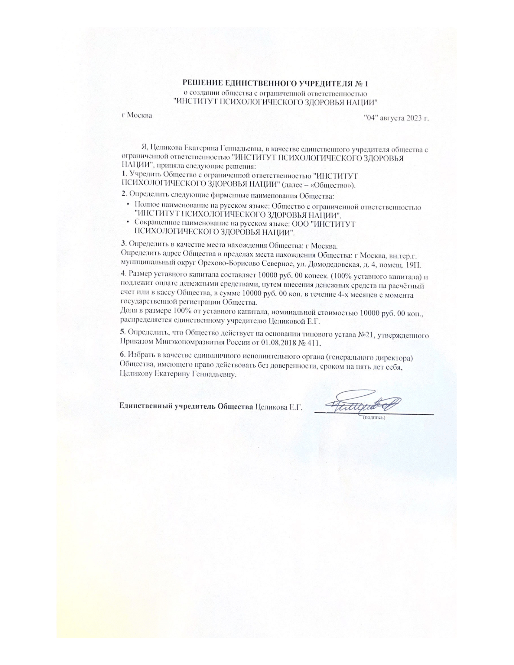 1. Устав ООО «Институт Психологического Здоровья Нации»